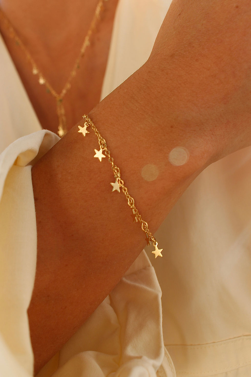 Su cadena de eslabones dorados permite numerosas posiciones y ajustes.